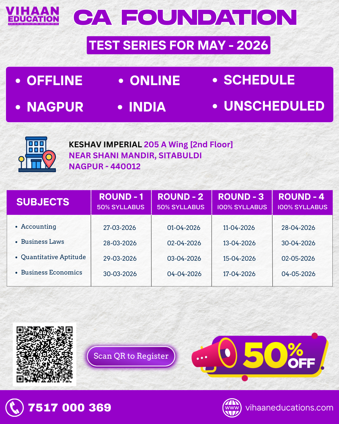 Vihaan Education presents a comprehensive CA Foundation Test Series – tailor-made by India’s most renowned faculties, designed to boost your accuracy, confidence, and exam-day performance.